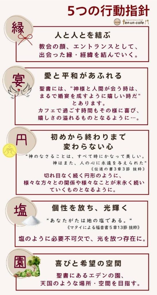 教会に通う人達の交流の場や、初めて教会に来られた方をもてなしたりなど、教会の玄関・顔としての役割を果たしていく。